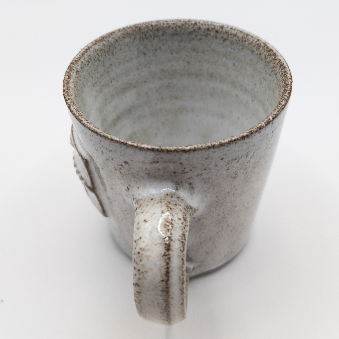 Brun handgjord espresso-/glöggkopp ur serien Hälsinge. Märkt med prästkrage och med mönster från Lundagården i Alfta.