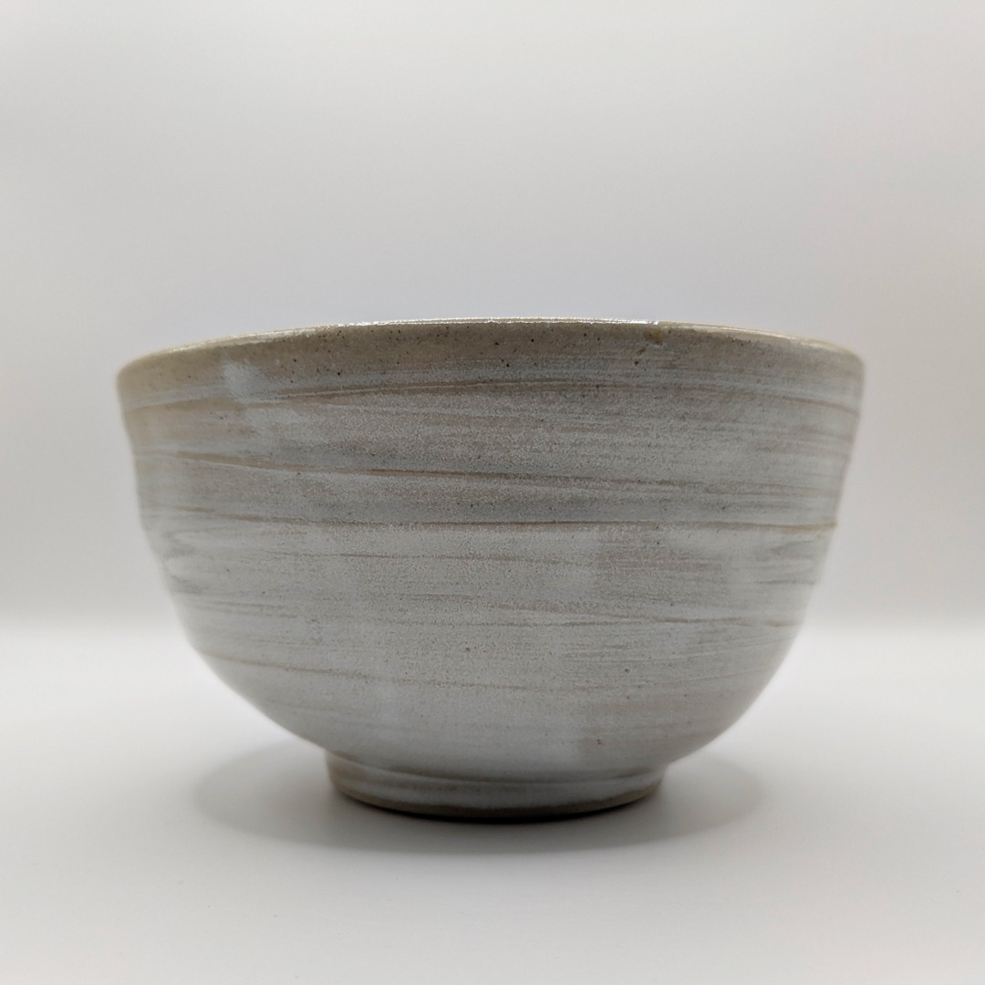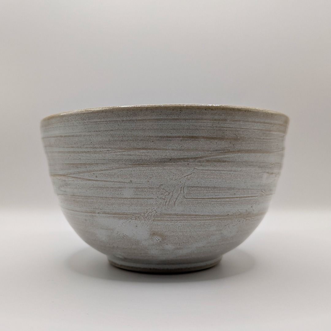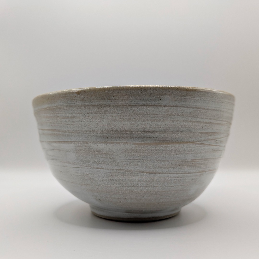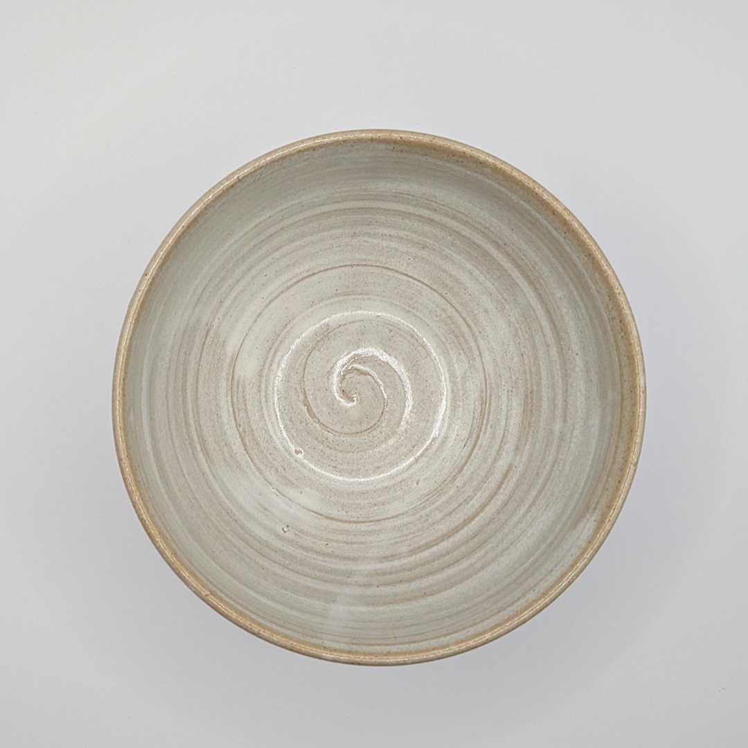 En rymlig skål i mjuka grå och vita toner som för tankarna till stilla moln över Hälsinglands himmel. Varje skål är unik och drejad för hand, med små variationer som gör den personlig. Perfekt som serveringsskål till sallad, pasta eller frukt – lika vacker till vardagsmiddagen som till festliga tillfällen.